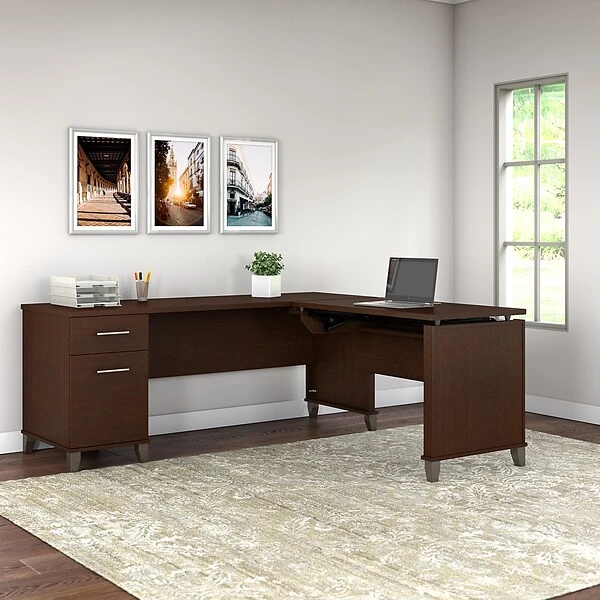 Upgrade your personal workspace with the ergonomic Bush Furniture Somerset 72W 3 Position Sit to Stand L Shaped Desk. As a quality alternative to desktop risers, the innovative 42W x 24D Sit to Stand Return offers all the health benefits of a standing desk with the versatility of more expensive electric height adjustable options. The built-in mechanical Lift-n-Lock system allows the desktop to lock into place at standing heights of 35, 38, and 41 inches and easily returns to a seated position. The 72W x 24D Office Desk includes a file drawer that opens on full-extension ball bearing slides for easy access to legal and letter size documents in addition to a box drawer for supplies and utensils. Fixed surfaces are tested to meet ANSI/SOHO standards for safety and performance while the mechanical lift is rigorously tested to Bush Furniture quality standards. Backed by a 6 Year Warranty.