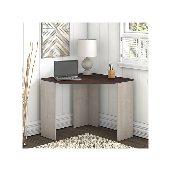The compact Bush Furniture Townhill corner desk combines the best of modern and traditional design to offer a stylish workspace for your home office. Perfectly sized for a dorm, apartment or small home office, the desk surface saves floor space while still providing enough room for a computer or paperwork. The design coordinates with the Townhill 2-shelf bookcase and lateral file cabinet (both sold separately) to create an all-in-one personal workspace. The desktop has a weight capacity of up to 200 pounds to support all your work materials. A 2-tone Washed Gray and Madison Cherry finish gives the Townhill desk a relaxed appearance that fits seamlessly with any transitional, cottage or modern farmhouse decor. This corner desk is tested to meet ANSI/SOHO quality standards for safety and performance and is backed by the Bush Furniture 1-year manufacturer limited warranty.