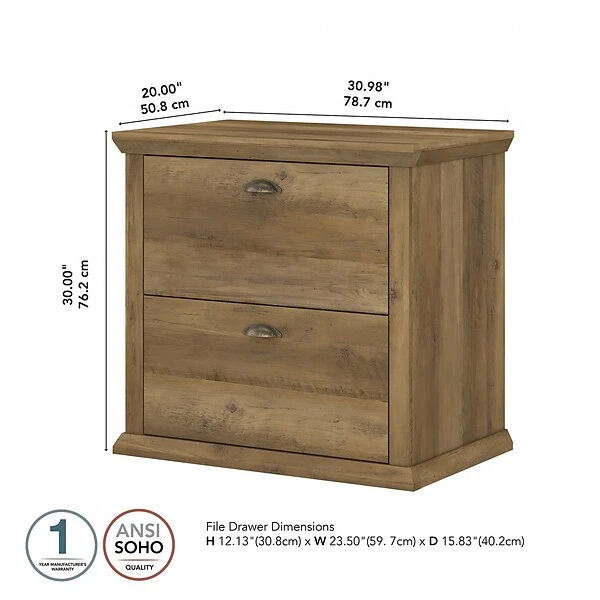The Bush Furniture Yorktown two-drawer lateral file cabinet presents a stylish and practical solution for organizing documents in any work or living space. Two file drawers open on smooth full-extension ball bearing slides for an effortless reach to letter-, legal-, and A4-size paperwork. The drawers are designed to extend one at a time for maximum stability on both hard and carpeted surfaces, and each drawer holds up to 50 lbs. of materials. The two-drawer file cabinet’s height matches that of the Bush Furniture Yorktown L-shaped desk, corner desk, and home office desk to create an extended work surface when positioned side by side. Bush Furniture Yorktown’s classic charm is highlighted by stylish beveled edge detailing and oil-rubbed bronze drawer pulls that complement your choice of finish. This lateral file cabinet is tested to meet ANSI/SOHO standards for safety and performance and is backed by a 1-year manufacturer limited warranty.