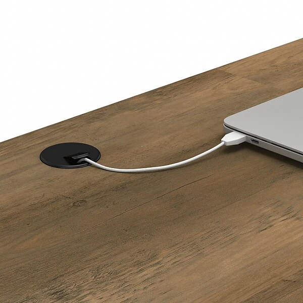 - Work surface includes two wire management grommets to keep cords and cables in order