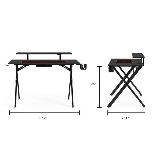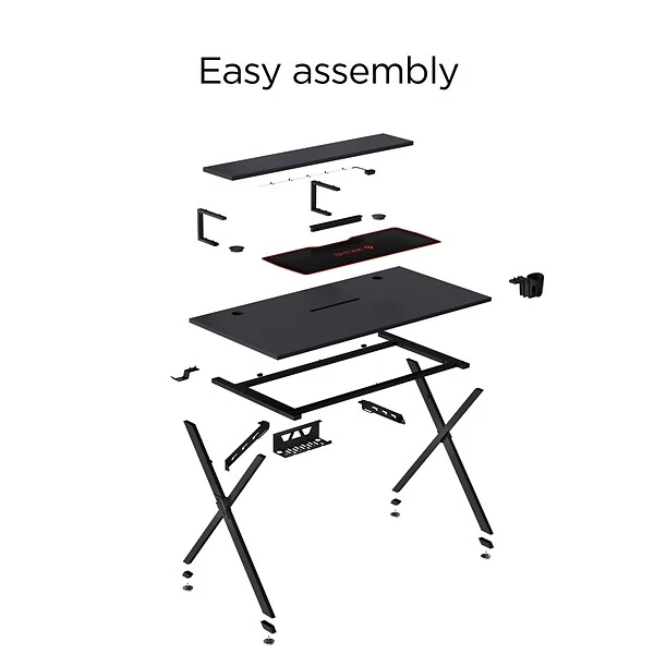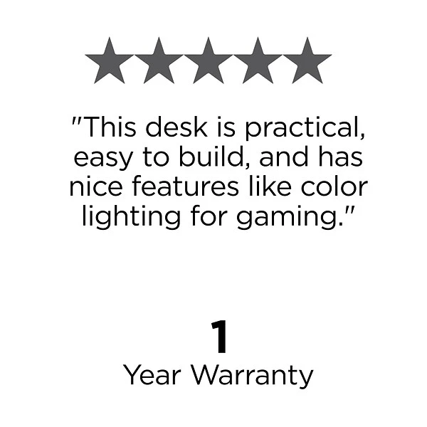 - Desk has a cable management tray, cable slot, and grommets for organization