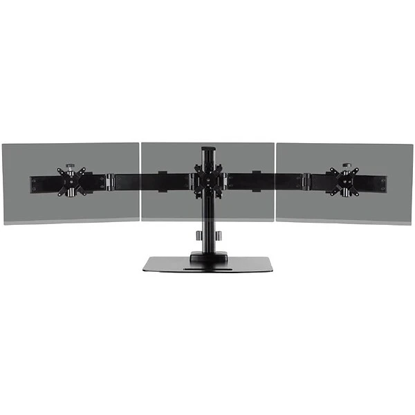 Ergotech’s 130 Series Triple Monitor Desk Stand allows you to position your displays at an ergonomic height anywhere along the column up to 17″. Displays move independently of one another so you can align bezels, even if your monitors are not identical. Plus tilt, rotate and pivot your display. Ask about alternate configurations using larger displays up to 43″. The heavy duty weighted base is flat to allow placement of anything on top.