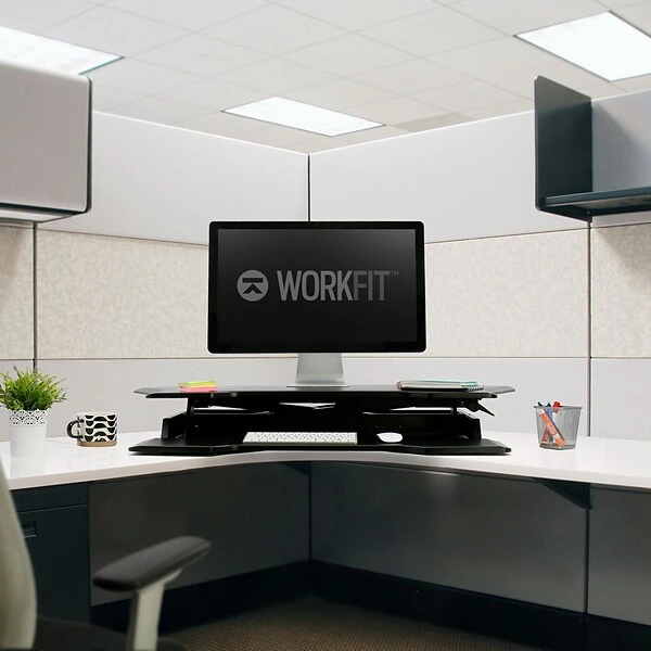 The WorkFit Corner sits flush to any cube or office corner thanks to a large notched worksurface that fits single and dual monitors. Get more from your corner configuration by using up dusty corner space and taking advantage of more worksurface on both sides of your sit-stand workstation. Designed with the corner in mind, the WorkFit Corner Standing Desk Converter offers 15 inches (38 cm) of easy vertical adjustment so you can work sitting or standing without bumping into cube or office walls.