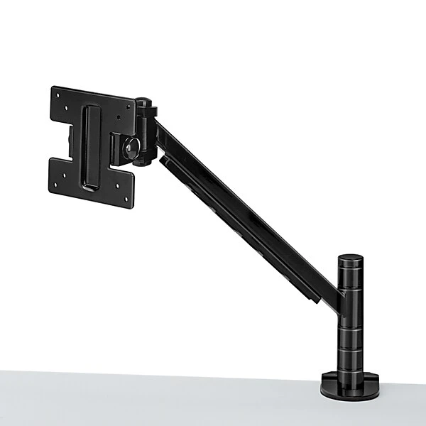 Space-saving Fellowes® Designer Suites™ Flat Panel Monitor Arm elevates monitors to comfortable viewing height to prevent neck strain. Easy to mount – two piece clamp mounts monitor between desk and cubicle wall. Height adjustable arm moves up or down to five positions (1” increments each). Supports monitors up to 20 lbs. Tilts up or down +/- 45°, pivots left to right 180°, and allows 360° screen rotation. Clamps to surfaces up to 2 ½” thick (2” desk overhang required) or mounts in grommet hole. Includes cord management system. VESA compliant.