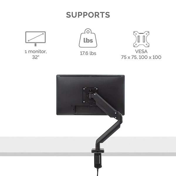 - Supports one (1) monitor: up to 17.6 lbs. and 32 inches