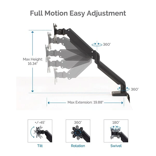 - Fully independent adjustable arm: increase workspace flexibility with 19.75 inches reach and free up desk space