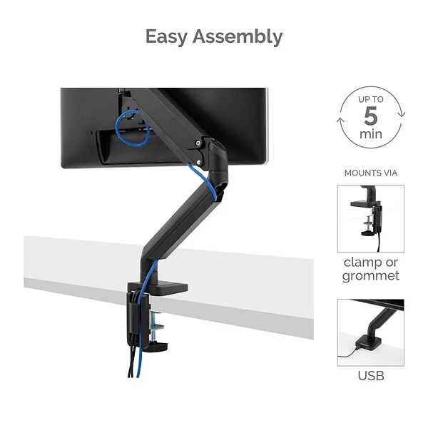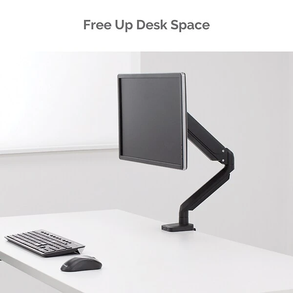 The Platinum Series Single Monitor Arm from Fellowes elevates your view to help relieve neck and eye strain while optimizing desk space. Fully independent arm holds up to 17.6 lbs. or 32” monitors and easily install using the Quick Fit VESA plate. The arm feature gas spring technology for effortless adjustment and rotate for horizontal or vertical viewing. Includes two integrated USB charging ports at the base for convenient charging. Easily mounts to tables or desks via clamp (between .4”-3.35” thick) or grommet (between .33”-2.75” in diameter). Innovative cable management system reduces clutter keeping you productive.