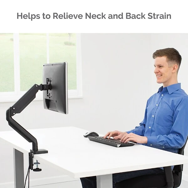 The Platinum Series Single Monitor Arm from Fellowes elevates your view to help relieve neck and eye strain while optimizing desk space. Fully independent arm holds up to 17.6 lbs. or 32” monitors and easily install using the Quick Fit VESA plate. The arm feature gas spring technology for effortless adjustment and rotate for horizontal or vertical viewing. . Easily mounts to tables or desks via clamp (between .4”-3.35” thick) or grommet (between .33”-2.75” in diameter).