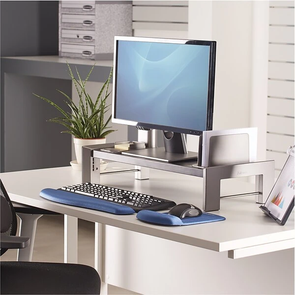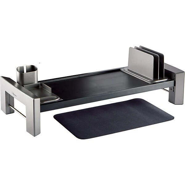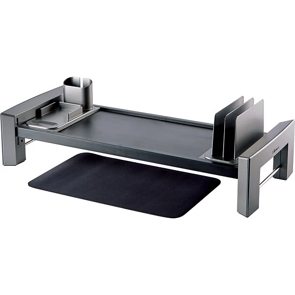Get a custom viewing angle for flat panel displays when using this stand, which offers a height adjustment range of 2.5 to 4.5 inches. Designed to facilitate organization, this stand includes an accessory tray and miniature paper sorter. Store a laptop or docking station on the Slick-Slide mat underneath the monitor shelf. This Fellowes Professional Series flat panel stand supports monitors weighing up to 40 pounds.