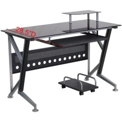 Achieve a healthier way of working with this contemporary, versatile computer desk. We all know that sitting for hours is an unhealthy practice, but with long workdays it has become more common. Standing helps strengthen leg muscles, improves your balance and promotes healthy blood flow. Standing even burns more calories than sitting. This ergonomic desk gives you the option to sit down or stand up. The pneumatic lever allows you to easily adjust the height with minimal effort. When preparing to work you should adjust the desk so the surface is at the most comfortable position for typing. The large surface make this desk suitable for laptop and desktop usage. Since desktops are heavier than laptops, front adjustable glides were added to the front of the desk, while locking glides are added to the back legs, making this desk essentially mobile.