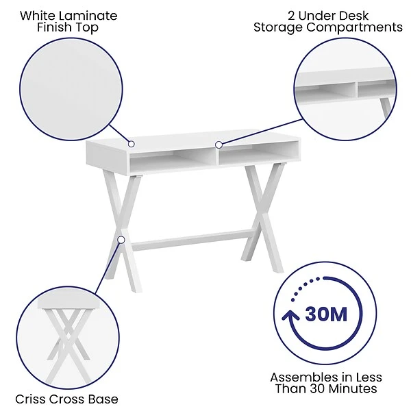 Create a comfortable and stylish place with this computer desk featuring 2 open storage compartments. Whether you’re working from home, a full time student, or an aspiring writer it’s important to have a space you enjoy spending time in. The smooth rectangular laminate top provides ample room for your desktop or laptop and boasts a clean white finish. This home office desk has 2 open storage nooks to hold important papers and office accessories. The strong and durable frame is made from wood and is capable of holding up to 200 pounds static weight capacity. The laminate top protects against chips and scratches and is easily cleaned with a water based cleaner. The integrated floor glides protect floor surfaces when you need a change of scenery in another room. With a medium assembly level, you can have your new desk up and ready to decorate in under 30 minutes.