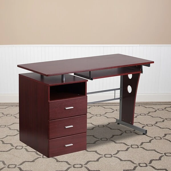 Accomplish it all on this executive pedestal computer desk. Talk about storage, this desk packs in a lot while maintaining a small footprint. You’ll have plenty of space for your laptop, desktop monitor and other office necessities that you can keep within reach. Four storage compartments, one open, three enclosed behind drawers will keep your work space tidy. The keyboard tray can double as a place to store your writing materials and small devices while you’re working on your laptop. Upgrade to a new desk that is full of function to power through your work day.
