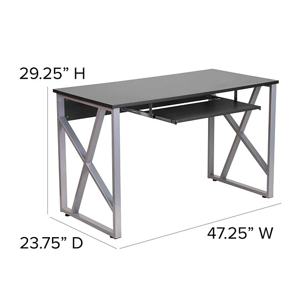 The contemporary design features a rectangular black laminate top, a space-saving, sliding keyboard tray and attractive, silver powder coated, designer cross braces on both sides. Self-leveling floor glides keep your desk from wobbling on uneven floor surfaces and protect your floors by sliding smoothly when you need to move the desk. A panel, across the front, reinforces the frame as well as offering some privacy to the desk’s occupant.