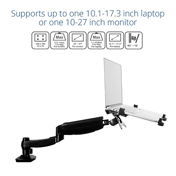 Fleximounts laptop mount fit 11-17.1 inch Notebook/laptop with supplied notebook tray or 10-27 inch monitor without the tray. Free gas springs hovering system Raise, lower, extend, retract, tilt and swivel your screen for ideal positioning. Reduce glare with a simple adjustment. Cable management. Loading Weight-bearing: 3.3-11 pounds. 85 degrees upward, 15 degrees downward. It can work both clamp and grommet. The mount can clamped to desk within 0.79”-3.94” (20mm-100mm) thickness or grommet to the desk with the size of the hole: 0.33”-2.75” (8.5mm-70mm).