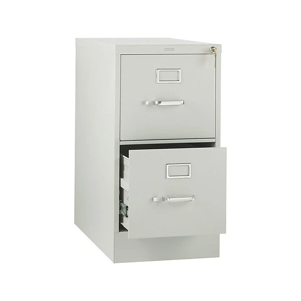 - Two-drawer vertical filing cabinet holds letter-size documents