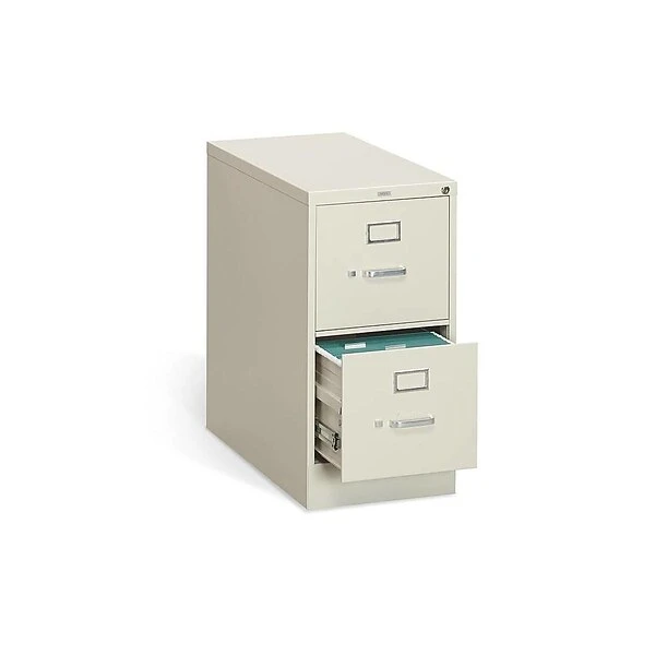 Get legal-size and other documents well-organized in this two-drawer filing cabinet. Built-in label holders let you easily identify stored records, and a tilt and slide follower block in each drawer keeping files upright and neat. This HON vertical file cabinet has thumb latches and a replaceable lock for secure closure, and the steel ball bearing suspension system lets the drawers glide smoothly.