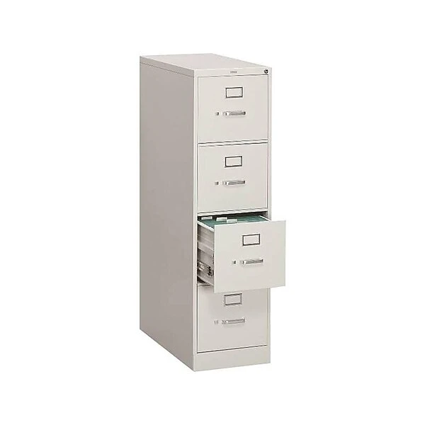 - Four-drawer vertical filing cabinet holds letter-size documents