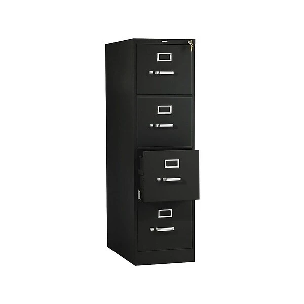 - Four-drawer vertical filing cabinet holds letter-size documents