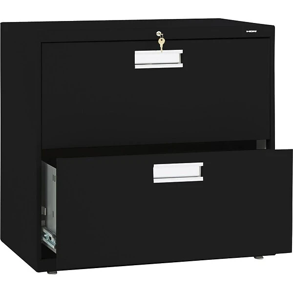 HON Brigade 600 Series Lateral file cabinet in black color is constructed from 30 percent post consumer materials. Lateral file cabinet measuring 28 1/2″ x 30″ x 19 1/4″ features two drawers for storing the files up to 2.41 cu. ft.