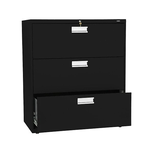 - Three-drawer lateral filing cabinet holds letter- or legal-size documents
