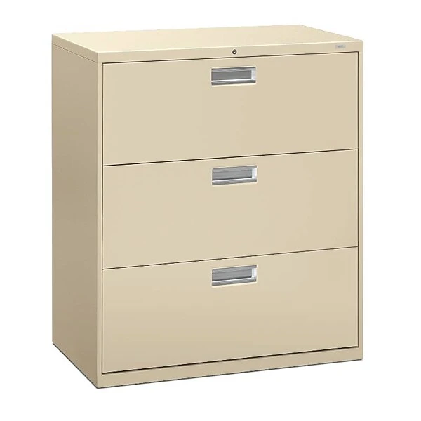Give important files dedicated space in your office with this HON Brigade 600 series lateral file. A built-in counterweight prevents tipping when one of the three spacious drawers is opened, and a mechanical interlock prevents multiple drawers from opening at the same time. With a two-sided lock mechanism and removable lock core, this HON Brigade 600 series lateral file keeps sensitive documents securely tucked away.