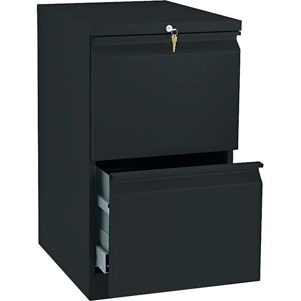 With its sleek black finish, the HON Brigade two-drawer radius-pull mobile pedestal file allows you to create extra storage space without compromising the style of your office. The file comes with two spacious high-side drawers on smooth ball-bearing suspensions, each designed to hold letter-size files. Four swivel casters enable easy movement, and the HON interchangeable-core lock ensures maximum security.
