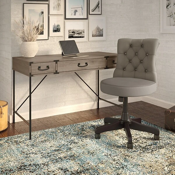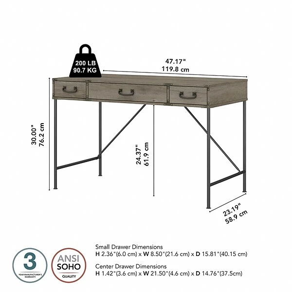 For a practical home workstation packed with vintage charm, choose the Kathy Ireland Home by Bush Furniture Ironworks 48″W writing desk with drawers. The compact, durable desktop is perfect for small spaces while still offering plenty of room to spread out with a computer, paperwork, and more when taking on the task of the day. A center drawer with a flip-down front provides a convenient place to store your keyboard or laptop, and box drawers on either side keep office supplies and writing utensils close by. A distressed finish and aged bronze hardware create a vintage industrial design with long-lasting appeal, while the welded steel base gives the computer desk a weight capacity of 200 lbs. and adds to its unique rustic styling. This home office desk with drawers is tested to meet ANSI/SOHO quality standards for safety and performance and is backed by a 3-year manufacturer’s warranty.