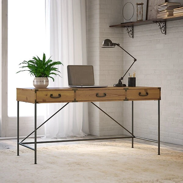 For a practical home workstation packed with vintage charm, choose the Kathy Ireland® Home by Bush Furniture Ironworks 60W Writing Desk with Drawers. The durable and spacious laminate surface offers plenty of room to spread out with a computer, paperwork and more when taking on the task of the day. A pullout center drawer with a flip down front provides a convenient place to store a keyboard or laptop, and box drawers on either side keep office supplies and writing utensils close by. A weathered finish and Aged Bronze hardware create a vintage industrial design with long-lasting appeal, while the welded steel base provides structural strength and adds to the Desk’s unique rustic styling. This affordable home office table is tested to meet ANSI/SOHO standards for quality and durability and is backed by the Bush Furniture 3 Year Manufacturer’s Warranty.