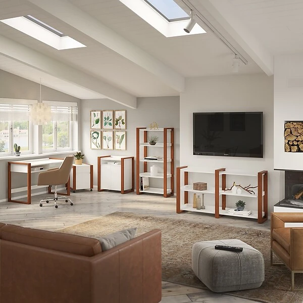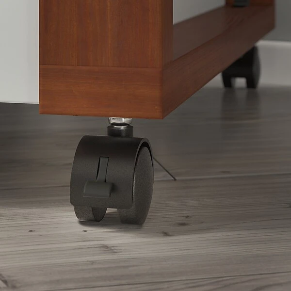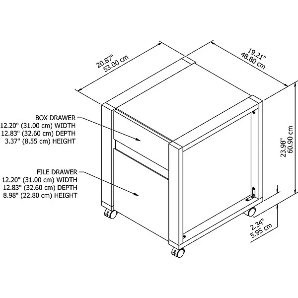 Bring the unique styling of Scandinavian decor to your living space with the kathy ireland® Home by Bush Furniture Voss single-file-drawer mobile cabinet. Keep paperwork and office supplies easily accessible. Designed with style and versatility in mind, this filing cabinet offers a practical storage solution that’s perfect for virtually any residential space. The file drawer opens on smooth, full-extension ball-bearing slides for effortless access to letter-size documents, while a box drawer provides an ideal place to keep smaller items like pens, pencils, and notepads. Four lockable dual-wheeled casters allow the file cabinet to move freely throughout your workspace for flexible and secure positioning.