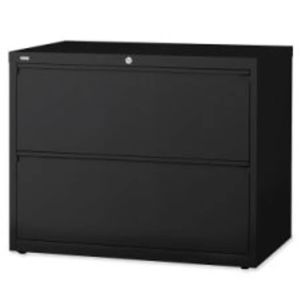 - Lateral file features two drawers with hanging file rails for side-to-side filing in letter-size, legal-size, or A4-size