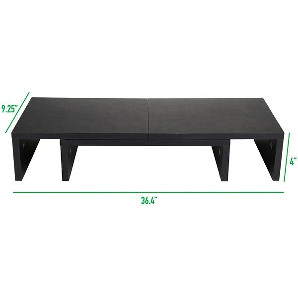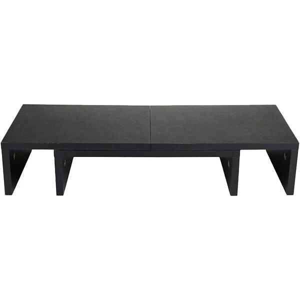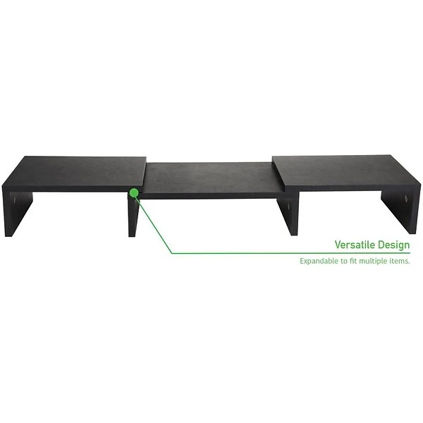 Make the best of a messy desk with additional support and extra space for your school or work supplies using this adaptable dual-monitor riser from Mind Reader. Constructed from sturdy MDF, it elevates your monitor (or monitors) to a comfortable angle for natural viewing positions, reducing eyestrain and neck pain from staring at uncomfortably positioned screens. Place your laptop on it to improve air circulation and extend your use time, resulting in less overheating along with the physical benefits. You can even use it to hold a television, books, or crafting supplies, or as a display stand. The sturdy monitor support also offers ample storage in the clearance underneath, allowing you to stash your supplies out of the way while providing easy access whenever you need them. Choose from multiple width configurations to create the setup that’s best suited to your individual needs; extend both sides, one side, or leave the sides fully or partially closed to create your own custom riser configuration. A minimalist black design blends in easily and makes this monitor riser an absolute must-have for home and business offices alike, dorm rooms, and even classrooms. Save space and study smarter using this Mind Reader two-tier adjustable stand and organizer.