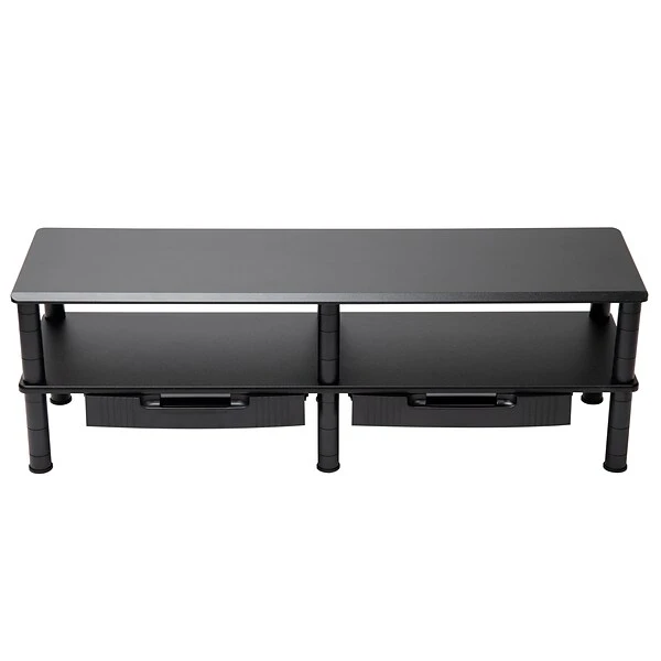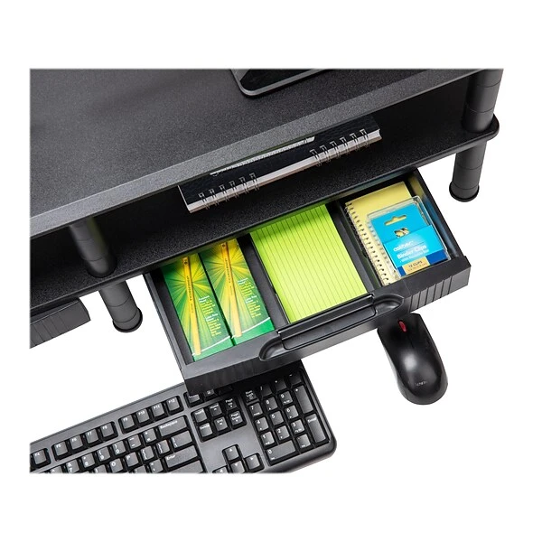 The combination of accessible storage within open shelves and a drawer underneath each side of the computer stand allows for ample spots to store everything from books to your computer accessories such as a mouse, keyboard, headphones, and speakers. Keep your work or study space tidy by corralling computer clutter into one area. Lightweight and portable, the dual monitor stand can be transported from your dorm room to your home or the office if needed. It works well to create vertical storage in smaller areas, such as work-from-home setups or small study nooks. Expand storage and increase comfort when you lift your laptop to meet your eye line, reducing the need to strain and bend to work or view content on your monitor. Easy to assemble and clean, just follow the directions to put the dual monitor riser together and prepare to declutter! When ready to clean your computer stand, wipe the durable plastic with a damp cloth. Gift the 2-tier monitor stand to a student heading off to college or a work-from-home friend that could stand some extra space to work. It’s also functional for teachers or a coworker managing a two-monitor work setup.