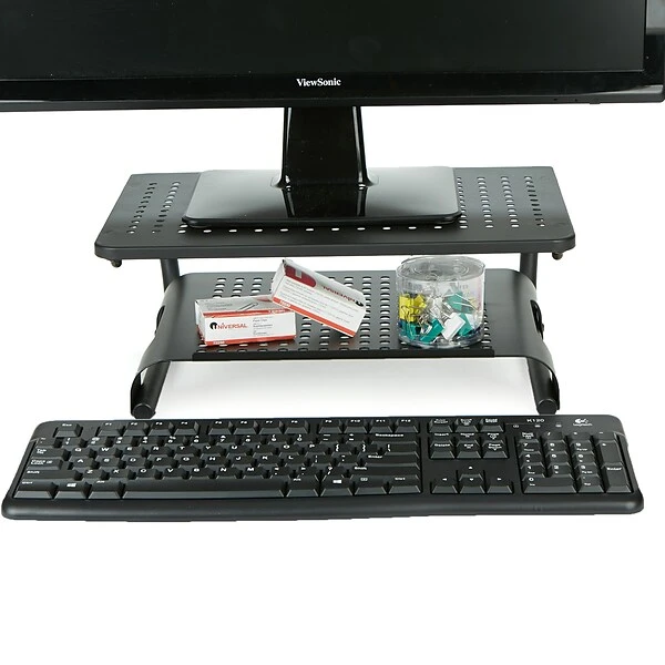 Raise your monitor in style with this two tier sturdy monitor stand. Its sleek mesh like design allows for ventilation to your laptop or computer monitor. This stand also allows you to store things away such as a keyboard, mouse or other office supplies.