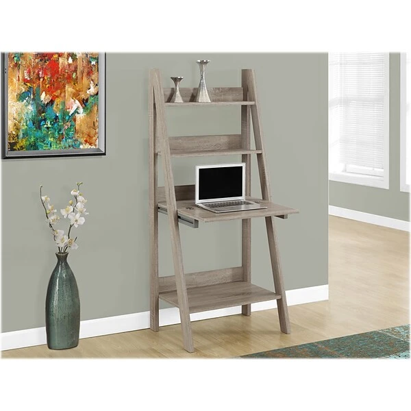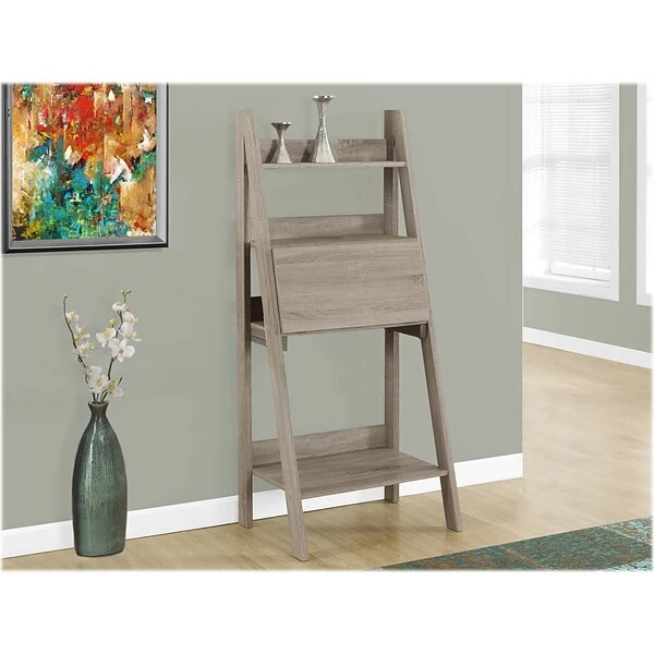 This multifunctional contemporary-style computer desk/bookcase offers a compact work space that is ideal for apartments, condos, or small homes. With clean lines in a warm dark taupe wood-look finish, this desk will blend easily with your home decor. The top ladder-style shelves can be used to display pictures and decorative pieces, while the closed storage area can be dropped down into a desk, with an additional bottom shelf for books or accessories. Add this convenient and functional workstation, where ample storage options, excellent functional features, and sophisticated style come together, to your home.