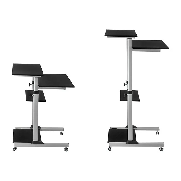 Create an ergonomic work area with this rolling stand-up desk. Tighten the two adjustment knobs by hand to move it from 37 to 54 inches when you’re ready to change position. The four platforms provide ample space for the basics and accommodate projectors for presentations, and each one holds 33 pounds for easy use with heavier equipment. Four caster wheels make this Mount it rolling desk simple to move.