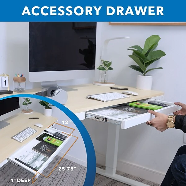 - Convenient accessories to create an organized workspace include two USB ports, 1 type C port, 1 drawer and cable management