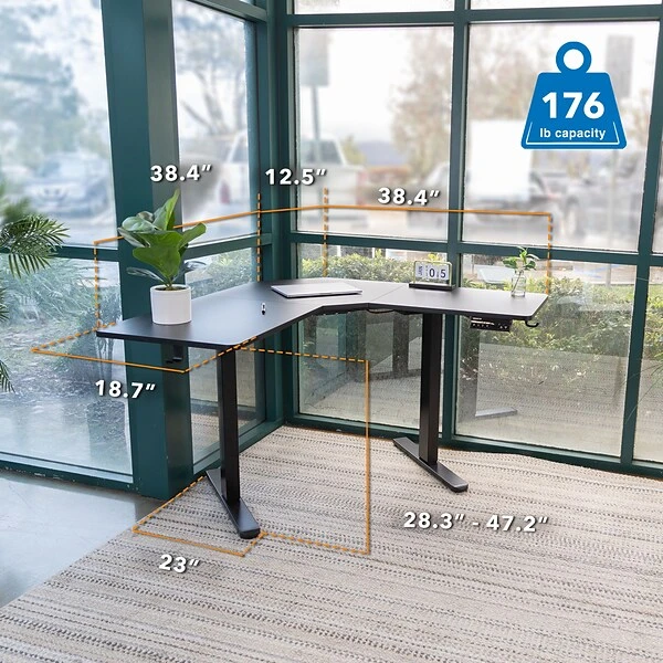 - Desktop dimensions: W (sides) 38.38″, D (sides) 18.7″, Corner W 12.52″
