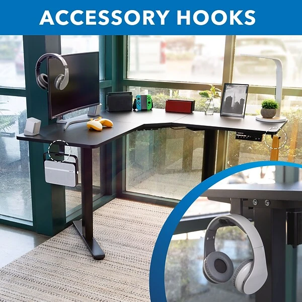 - Convenient accessories to create an organized workspace include two hooks and cable management