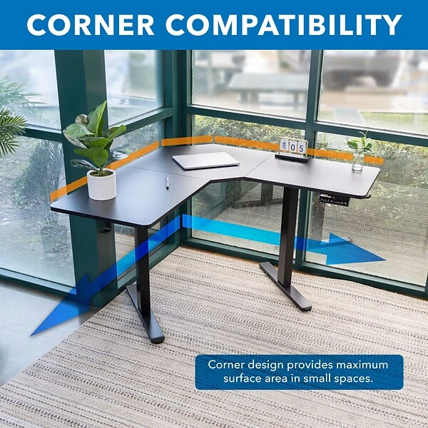 Switch between sitting and standing at the simple push of a button. The advanced LED control panel comes with three memory settings for your preferred sitting and standing heights. The integrated anti-collision function ensures that your desk does not bump into objects such as filing cabinets when it is lowered. To help you stay organized, the corner desk features two hooks for bags or headphones and cable management for neat cable routing. Two motors ensure smooth and quiet height adjustment between 28.3 and 47.2 inches.