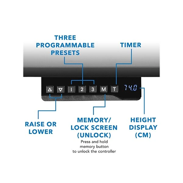 - Set your desk at three preset heights, memory, and a timer function to help remind you when to sit and stand during the day