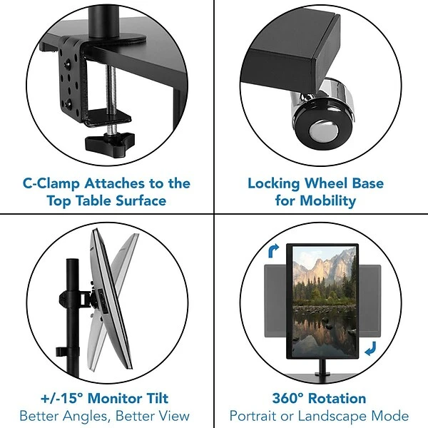 - Features a clamp-on, height adjustable single monitor mount that allows you to mount VESA monitors up to 32″ with a max capacity of 22 lbs.