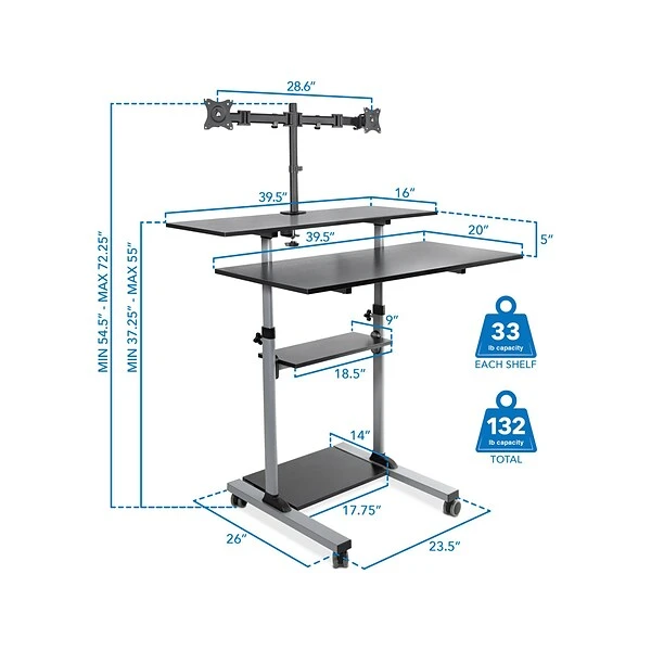 This cart is ideal for use as a mobile computer/laptop station at the office, home, hospitals, showroom, and classroom. Carefully designed platforms provide ample space for monitors, keyboards, mouse pad, a PC tower, and a printer. It comes with a dual monitor mount that is easy to install using the c-clamp base, and can be easily taken off at any time. Easy-roll casters move in every direction, allowing it to be conveniently relocated from room to room. The locking casters allow the cart to be stationary or mobile when desired. All necessary hardware and installation instructions are provided for assembly.