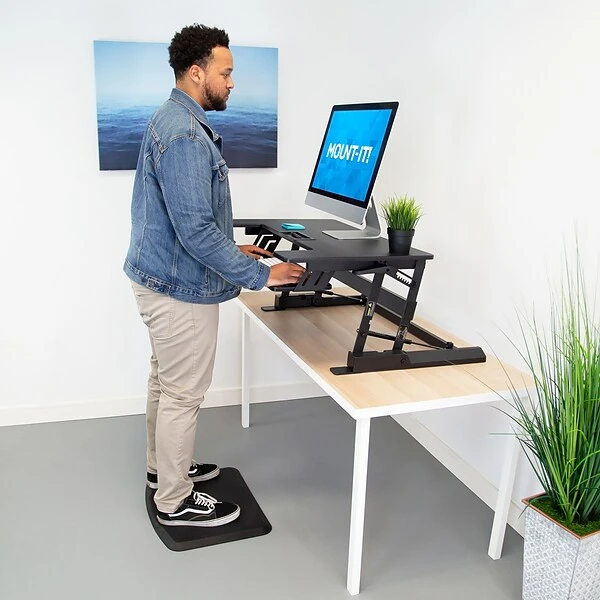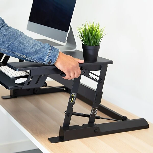 The manual height adjustable standing desk converter features a wide 36” tabletop and can adjust from 6.25” to 16.5” high, allowing you to create a customized setup throughout the day.
