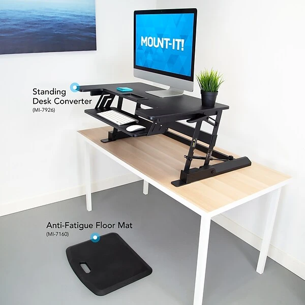 This bundle includes a height adjustable manual sit stand desk converter large enough for two monitors and a soft anti-fatigue mat for more comfort and less pain while standing at work. The Active Essentials Plus ergonomic bundle can easily and quickly turn any existing workspace into a healthier, more active workstation and is perfect for those looking to create a more comfortable and ergonomic work environment.