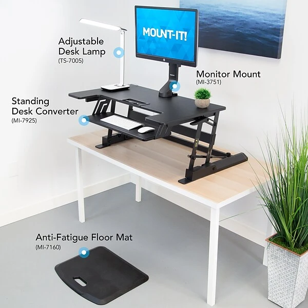 Place this pre-assembled desk converter on your existing desk to start immediately enjoying the benefits of a standing desk. Paired with our single monitor mount for standing desk converters, anti-fatigue floor mat and LED desk lamp, this workstation bundle was created to drastically improve your workspace. Improve your health and wellness, while maximizing efficiency and workflow with this ergonomic workspace upgrade. The manual height adjustable standing desk converter features a wide 36” tabletop and can adjust from 6.25” to 16.5” high, allowing you to create a customized setup throughout the day. The single monitor mount included in this bundle is designed specifically for sit stand desk converters. Its low-profile base allows the desk converter to lower to its lowest position without the c-clamp hitting the desk it’s sitting on. Our anti-fatigue mat is a necessity with any standing desk. The soft cushy floor mat is designed to allow you to stand longer at your standing desk without the pain associated with prolonged periods of standing. Our Relaxalight LED Desk Lamp features 7 levels of brightness control, temperature color settings and includes a USB port to charger your devices.