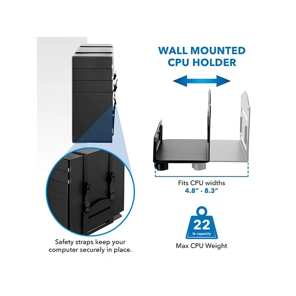 This Mount-It! dual-monitor wall mount workstation is designed for commercial and industrial use, but can be used almost anywhere. The mount holds two monitors, a keyboard and mouse tray, and a desktop computer CPU, in a compact and ergonomic package. The wall-mounted design saves space and can be adjusted for the needs of multiple users. The included metal PC mount with safety straps mounts the desktop computer next to the workstation for a cleaner and more compact installation, while also protecting the PC from accidental bumps and dust.
