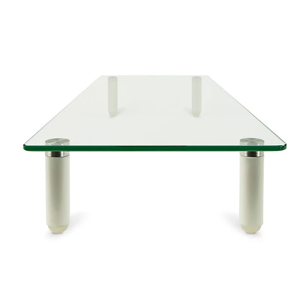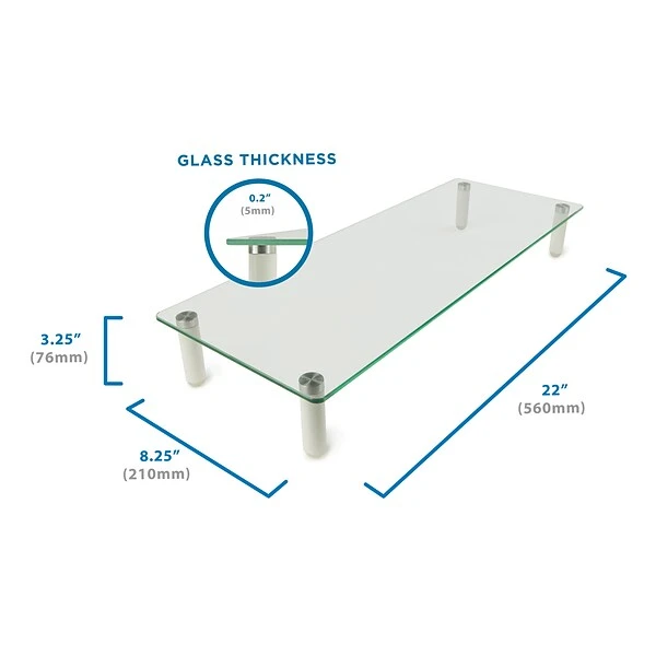 Mount-It! MI-7263 monitor stand elevates the display to a more comfortable height for optimal viewing experience and help reduce neck and eye strain. Contemporary design with the premium glass and Aluminum materials used makes it a perfect fit for any room or office. It is ideal for cramped workstations and desks as it expands your work area upward, maximizing your available work area. Its extended size of 22 inches by 8.3 inches accommodates a wide variety of computer monitors, printers and other miscellaneous office equipment and accessories. Additional space underneath the stand frees-up valuable desktop space for a laptop, a keyboard or paperwork. It also creates space for paper beneath a printer sitting on top, and countless other practical home and office applications. MI-7262 is sized large enough to fit any monitor or office equipment. It gives a boost of height you need while still having storage space available underneath the unit. It is perfect for any room, is easy to assemble and has a neutral clear glass with a reflective metal leg finish. The shelf is stabilized with two aluminum legs with a height of 2.75″. The legs have anti-slip silicone pads to offer additional stability to safely hold your monitor.