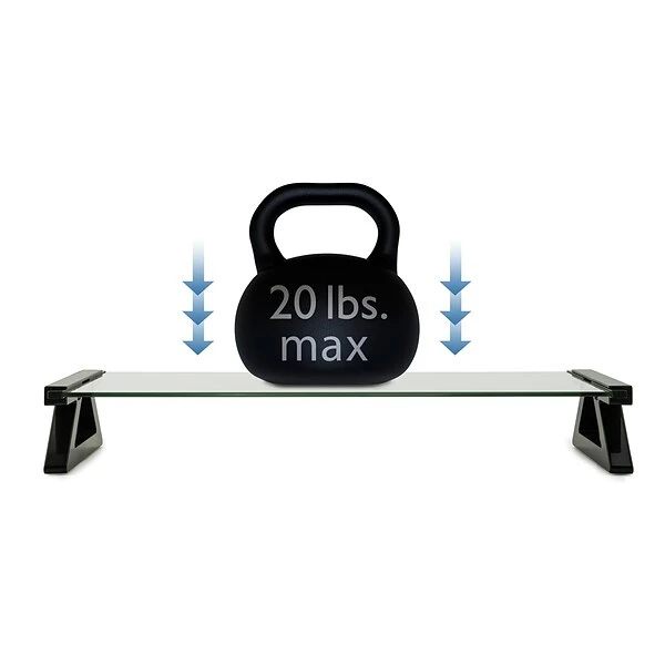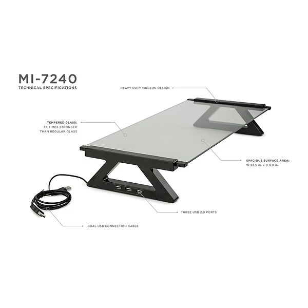 Mount-It! MI-7240 stylish black contemporary tempered glass Monitor, Laptop/Notebook stand that comes with 3 built-in 2.0 Hi-Speed USB ports with a Y-shaped USB power cord to power up your devices. This universal comptemporary stand will help create some desk space and organize your workstation. With this MI-7240 durable, tempered glass shelf it will elevate your Monitor, Laptop/Notebook or other devices such as such, as a printer, fax machine, game console, cable boxes and other streaming devices to 3 3/8,” which will create 3 ¼ inches of valuable desk space. Additional space underneath the stand frees-up valuable desktop space for a laptop, a keyboard or paperwork.