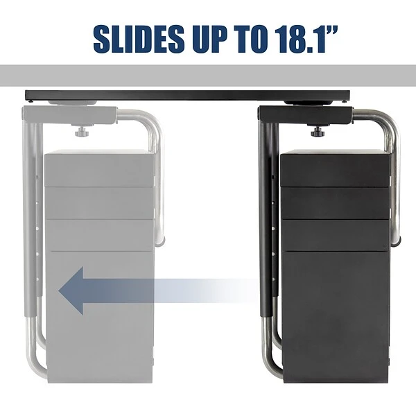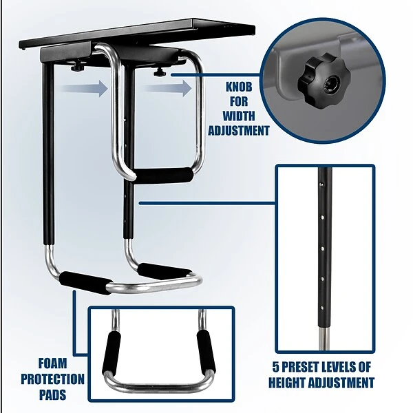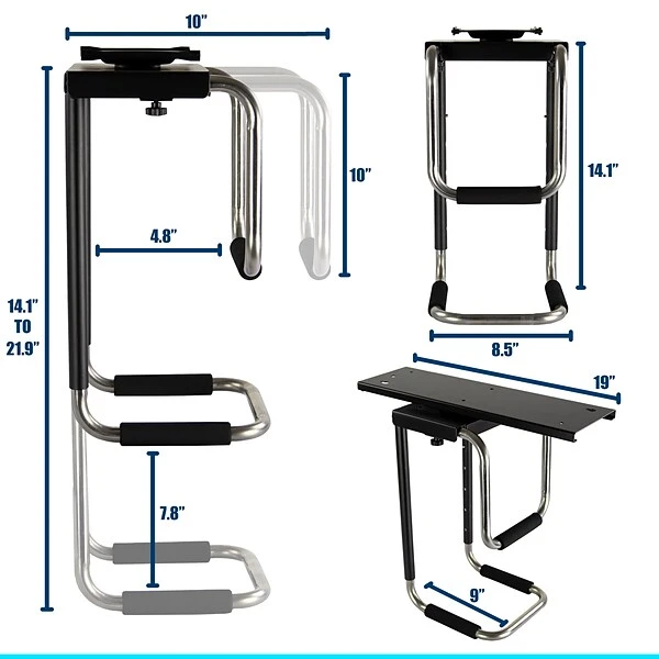 Place your CPU in a convenient and accessible location with the Mount-It! Adjustable Computer Tower Mount. The 360-degree swivel and 12.9″ of slide ensures easy access to cables and ports on the back of your CPU. It mounts to the underside of your work surface to keep it conveniently accessible. Keep your computer safe by raising it off of the floor, saving it from dirt and dust. Save floor and desk top space, while keeping your computer within reach with this CPU Computer Tower Holder. Constructed with solid steel to support up to 66 lbs., more than most competitors on the market.