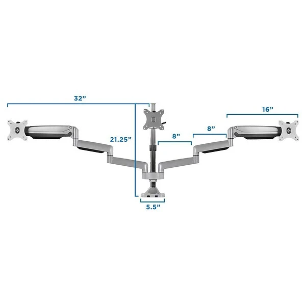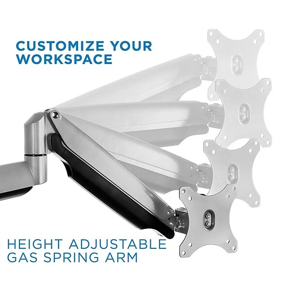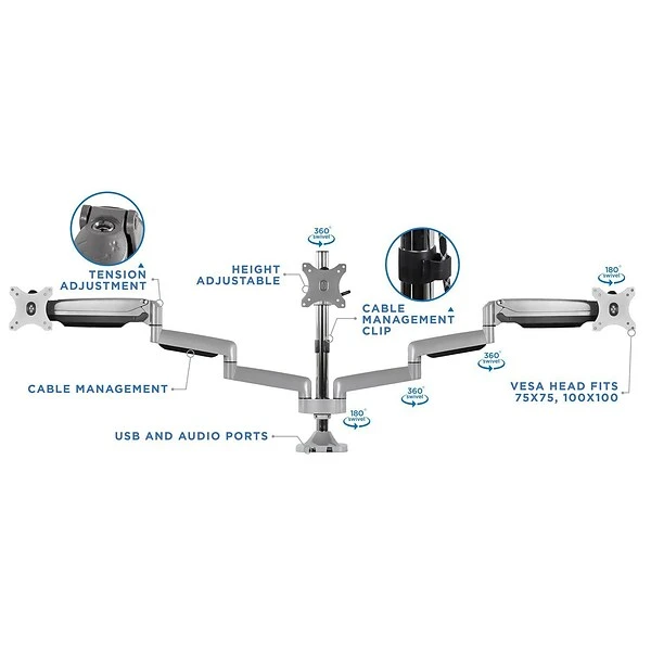 Create an efficient workspace with triple the screens, and say goodbye to neck, back, and shoulder pain with this monitor mount. Heavy duty steel and aluminum construction can hold three 32″ monitors. Height adjustable, full motion design lets you work in a more comfortable ergonomic position. Quickly tilt, swivel, and rotate your screens as needed while you work. Base includes built-in USB, audio, and microphone ports that can be connected to your CPU. Integrated cable management system keeps cords organized.